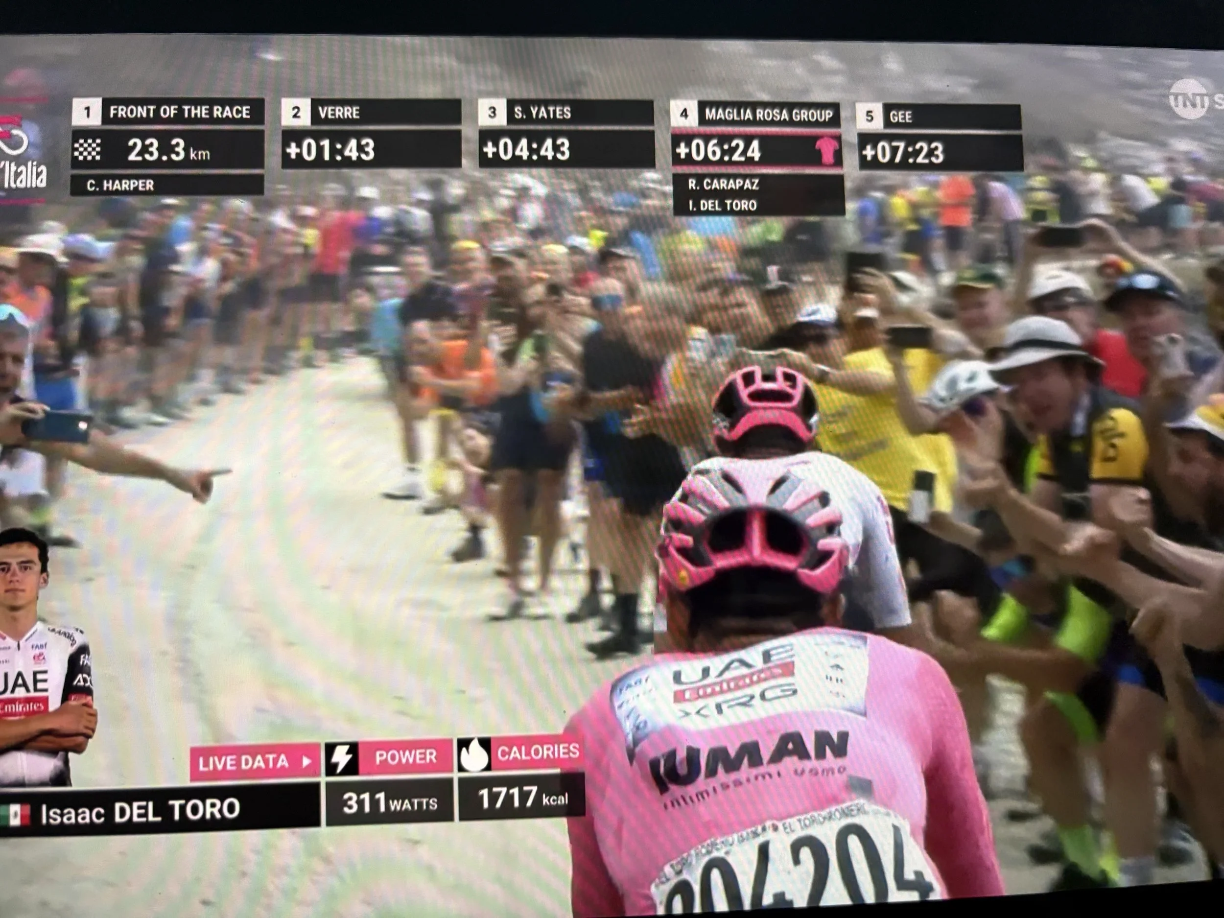 Yates crested the summit, the Cima Coppi, descended, caught up with Van Aert who went mental on the front, towing his teammate so hard that by the finish, Yates had pulled more that five-minutes out of Del Toro and won the Giro. Then, things got even worse.