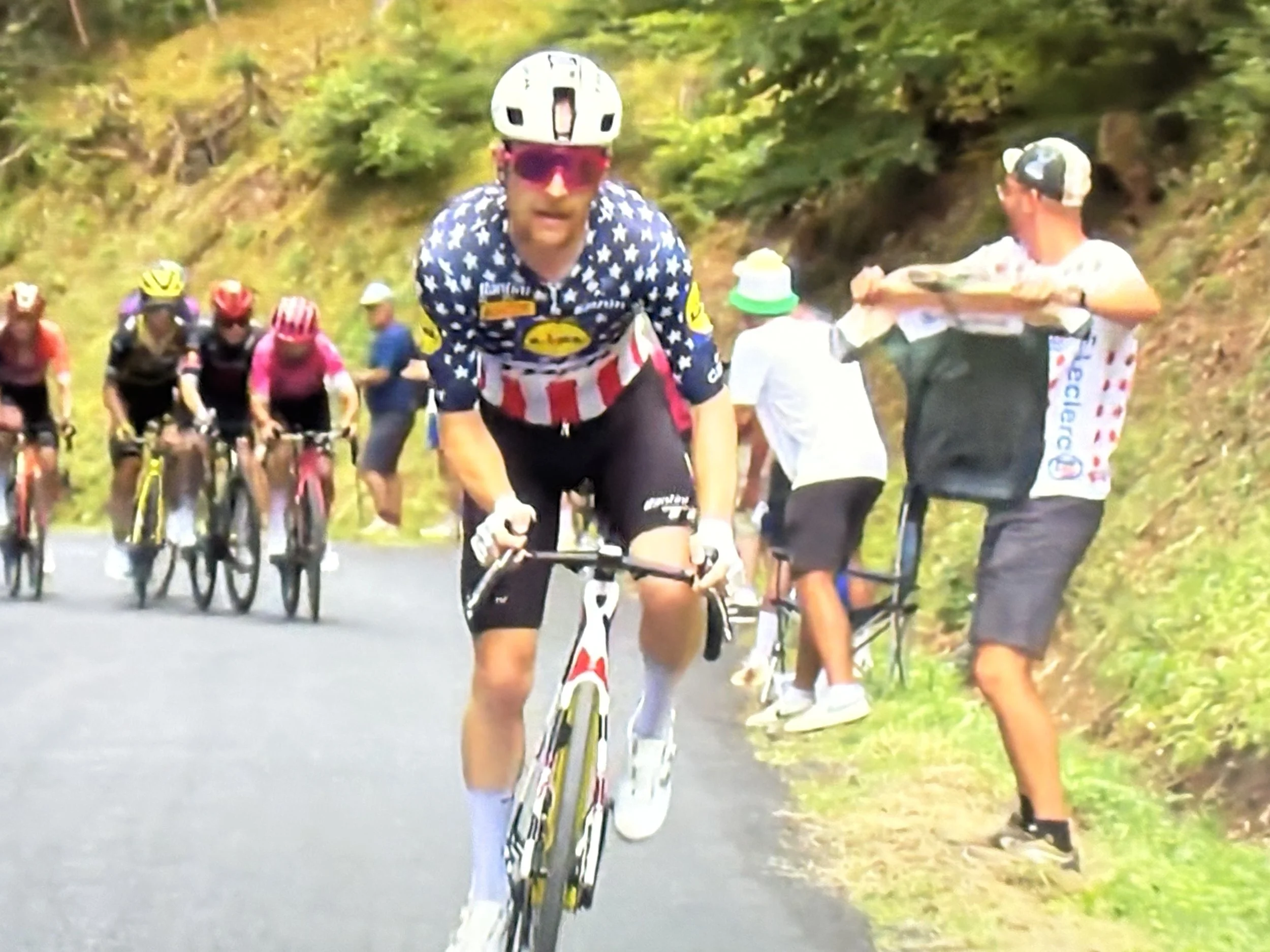 The last two stages, in Puy and the fantastically successful one yesterday around Toulouse, have been marvels for the sport. The EF Education – Easy Post squad went out on a mission to get Healy the Yellow Jersey on Stage 10, fighting for it every inch of the way to the line. Especially riveting was the pursuit match between EF’s big man Harry Sweeny at the front of the breakaway that was carrying Healy to the jersey, and the even bigger Nils Politt pounding on the front of the bunch, minutes back, for UAE. The two men, at the head of their respective groups, went at it for kilometers on end, both racing their guts out to the base of the final climb. Sweeny was the winner on that one, holding and even extending the gap between Healy and the Yellow Jersey Pogačar; Ben Healy owes, in large part, his hard-won jersey to the efforts of his Aussie teammate.